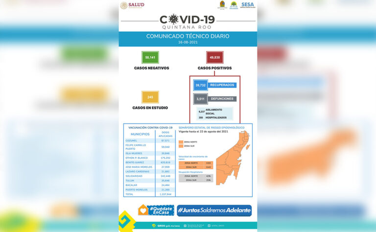 También se informa, dentro del mismo informe de la Sesa, que dentro de los esfuerzos de contención de la pandemia, se han aplicado hasta el momento en la campaña permanente de vacunación contra el virus, un total de un millón 337 mil 944 dosis de la vacuna contra el covid-19 en Quintana Roo.