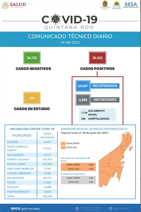 Quintana Roo continúa sumando mas contagios por covid-19, sin embargo, como ya es costumbre, este lunes la cifra de contagios por el virus disminuyó con respecto a los demás días de la semana, sin embargo, siendo para este 14 de junio, 72 casos nuevos, así como una lamentable defunción,