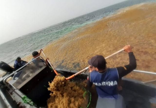 «De acuerdo a la imagen satelital de la Universidad del Sur de Florida permite visualizar que en el Caribe Mexicano hay aproximadamente 22 mil 250 toneladas de sargazo, y se calcula que en un periodo de seis días ingrese un aproximado de 9 mil 600 toneladas de algas a esta región por lo que se considera que la condición de alertamiento se presenta con probabilidades de abundantes» manifiesta la Semar.