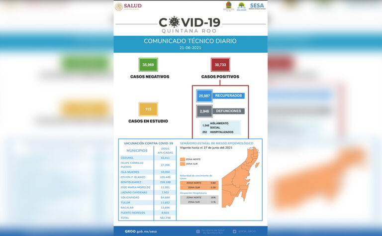 Quintana Roo reporta solamente 58 contagios por covid-19 este lunes. Situación que ya no sorprende, pues ha sido la constante de todos los lunes durante un número indefinido de semanas, igualmente se suman 6 defunciones más por esta causa al corte de este lunes 21 de junio.