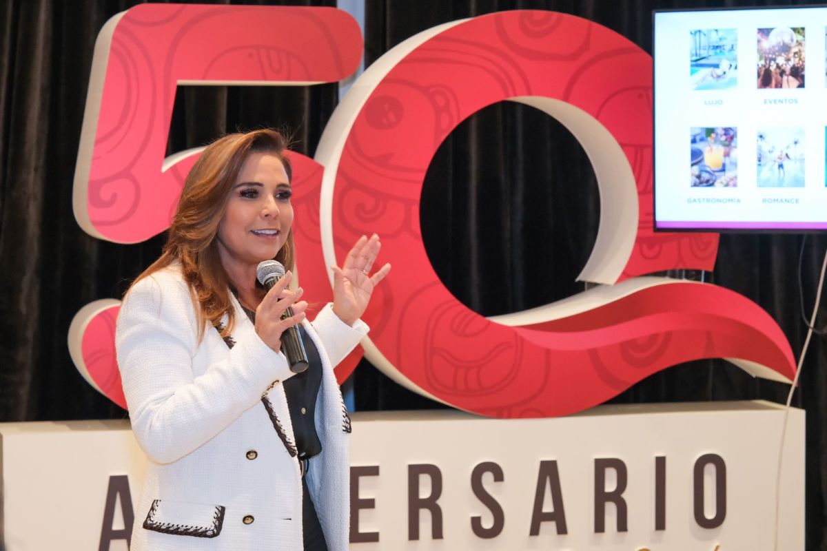 Acompañada de las presidentas municipales de Cozumel, Juanita Alonso Marrufo; de Benito Juárez, Ana Paty Peralta de la Peña; de Solidaridad, Lili Campos Miranda y de Puerto Morelos, Blanca Merari Tziu, la gobernadora compartió resultados de 2023 que confirman el liderazgo turístico mundial de Quintana Roo y su expansión como a los 12 destinos del Caribe mexicano que permitirá al mundo conocer a través del Tren Maya.