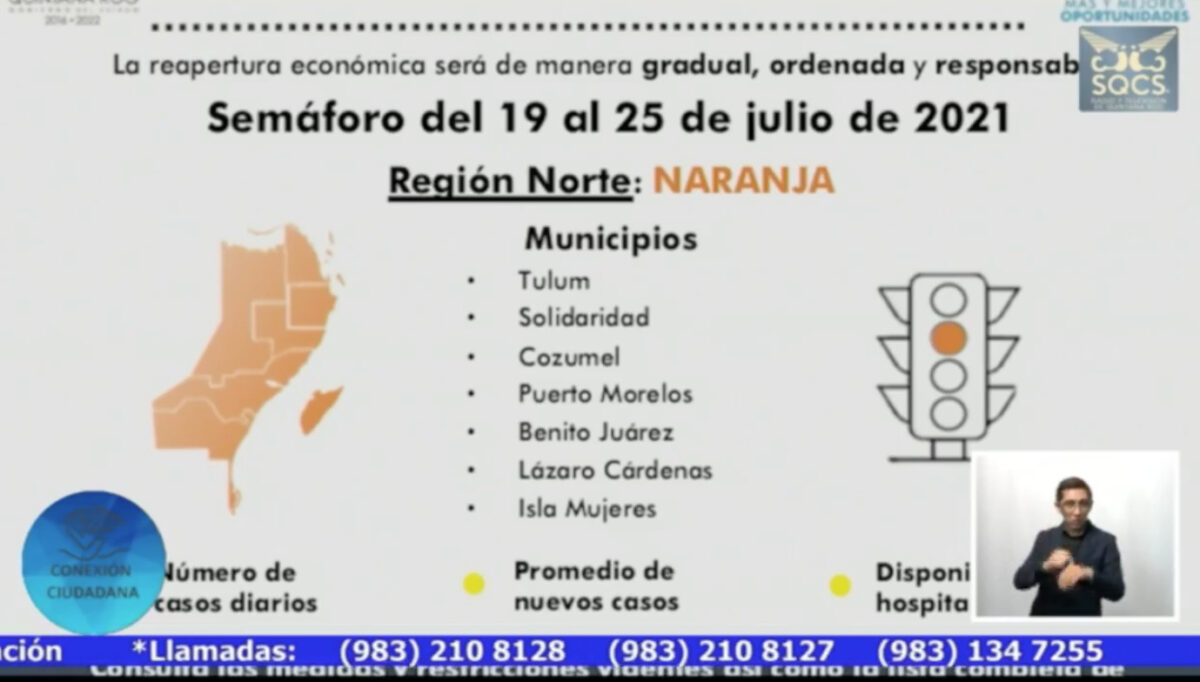 El jefe del ejecutivo estatal, en su participación en el programa «Conexión Ciudadana» que se emite a través del Sistema Quintanarroense de Comunicación Social (SQCS), actualizó el status de la entidad en el semáforo, poniéndolo en naranja desde el día 19 hasta el 25 de julio.