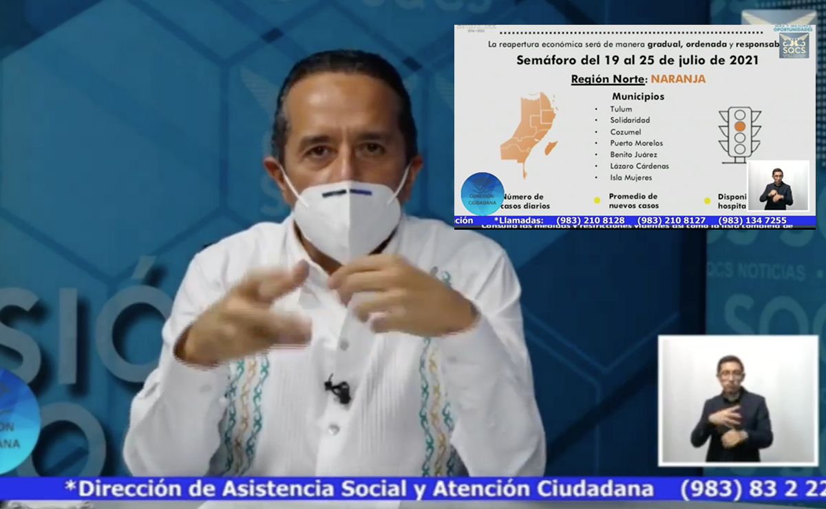 El jefe del ejecutivo estatal, en su participación en el programa «Conexión Ciudadana» que se emite a través del Sistema Quintanarroense de Comunicación Social (SQCS), actualizó el status de la entidad en el semáforo, poniéndolo en naranja desde el día 19 hasta el 25 de julio.