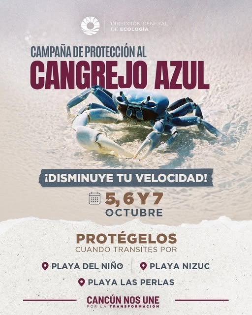 El Ayuntamiento de Benito Juárez, a través de la dirección de Ecología Municipal, invita a la ciudadanía a participar en la campaña de protección al cangrejo azul, que se realizará del 5 al 7 de octubre.