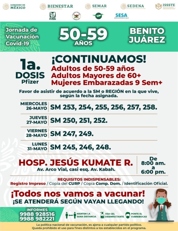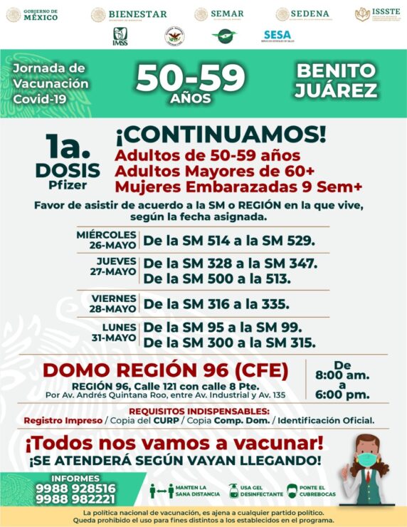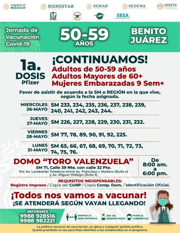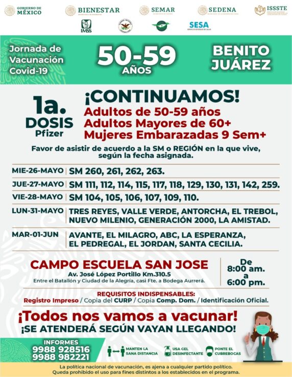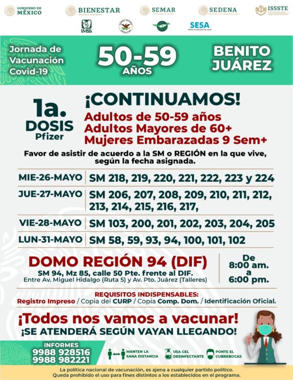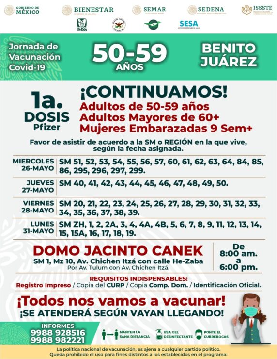 Reanudarán en Cancún campaña de vacunación contra covid-19, la cual dará inico este miércoles, habilitando varios módulos para agilizar la inoculación a adultos de entre 50 y 59 años.