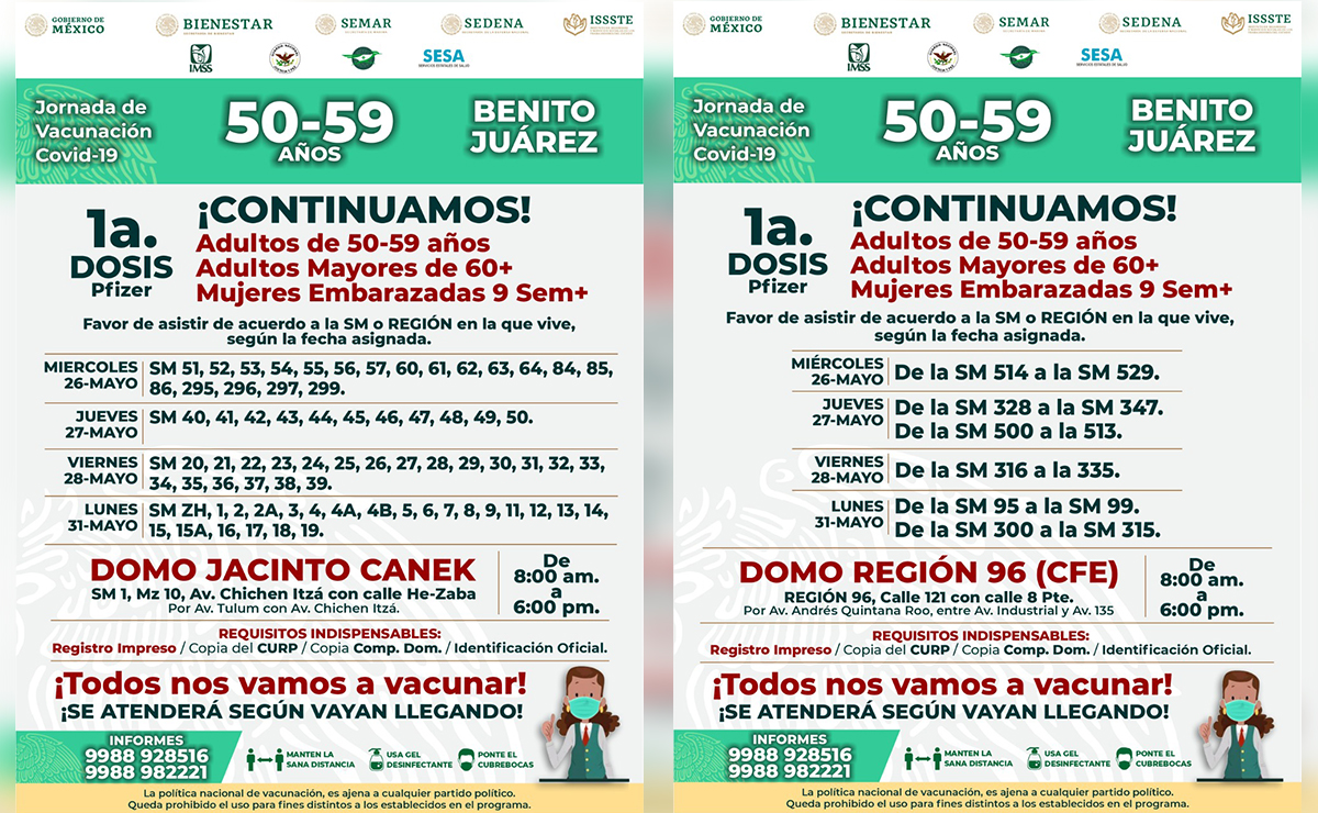 Reanudarán en Cancún campaña de vacunación contra covid-19, la cual dará inico este miércoles, habilitando varios módulos para agilizar la inoculación a adultos de entre 50 y 59 años.