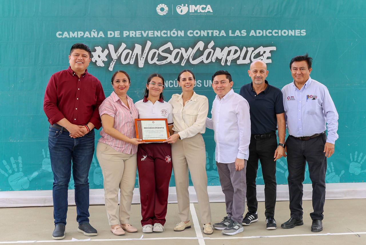 Cancún, Q. R., a 11 de febrero de 2026.– La presidenta municipal, Ana Paty Peralta, entregó el reconocimiento “Yo no soy cómplice” a la secundaria técnica No. 11 “Moisés Sáenz Garza”, por su apoyo y compromiso hacia los programas y actividades que realiza de manera permanente el Instituto Municipal Contra las Adicciones (IMCA) bajo el mismo nombre, para que la comunidad estudiantil viva libre de cualquier adicción, luego de la capacitación sobre varios temas a 160 alumnos.