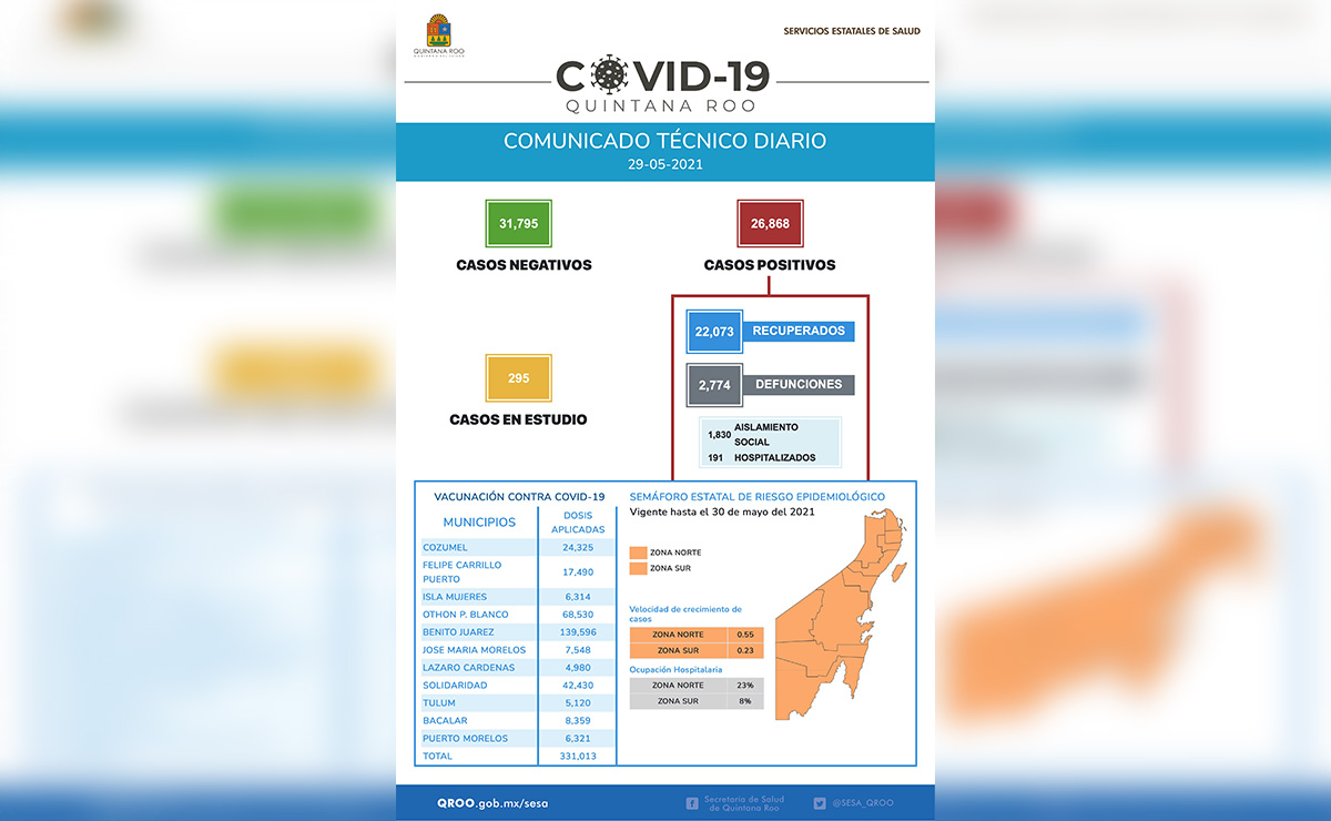 Paralelamente, dentro de los esfuerzos de contención de la pandemia, se han aplicado hasta el momento un total de 331 mil 013 dosis de la vacuna contra el covid-19 en el estado de Quintana Roo.