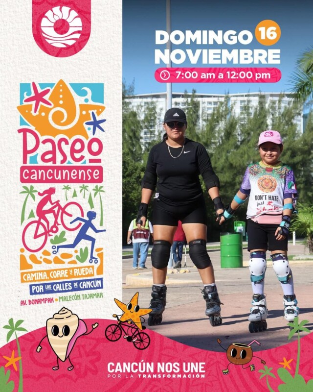 El Ayuntamiento de Benito Juárez, a través del Instituto Municipal de Planeación de Desarrollo Urbano (IMPLAN), realizará la 10ª edición del Paseo Cancunense, nuevamente en las inmediaciones de las avenidas Bonampak y Malecón Tajamar este domingo 16 de noviembre, con actividades para ciclistas, peatones, patinadores, familias con mascotas y todas las personas que quieran reconectar con la ciudad de una forma segura y activa.