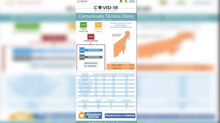 Quintana Roo reporta al corte de este 19 de febrero 51 casos nuevos de covid-19, así como cuatro defunciones más por esta causa lo que hace un acumulado de 19 mil 835 positivos, 16 mil 407 recuperados y 2 mil 259 defunciones por esta causa.