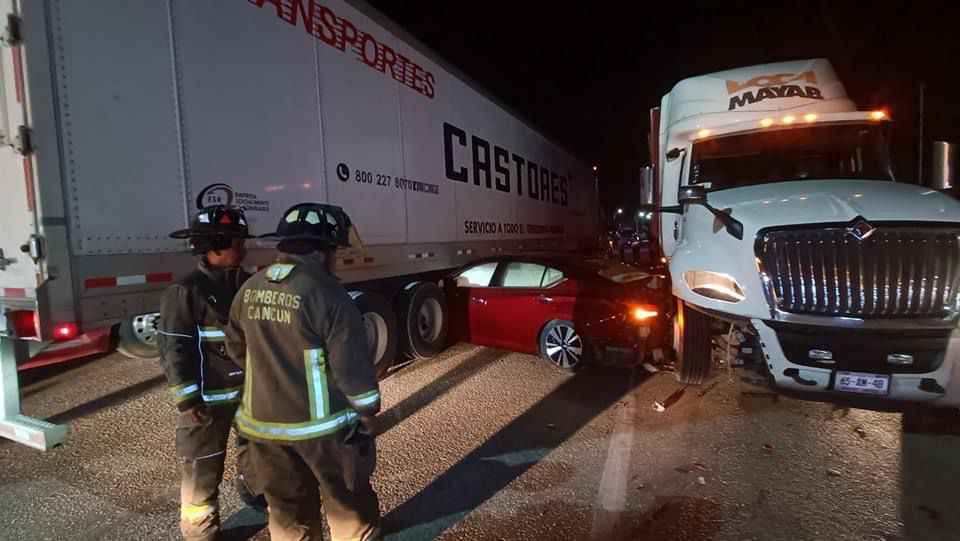 Un automovilista fue rescatado por los bomberos, luego de quedar atrapado entre dos tráileres en el libramiento Cancún-Mérida, a la altura de la avenida Huayacán.