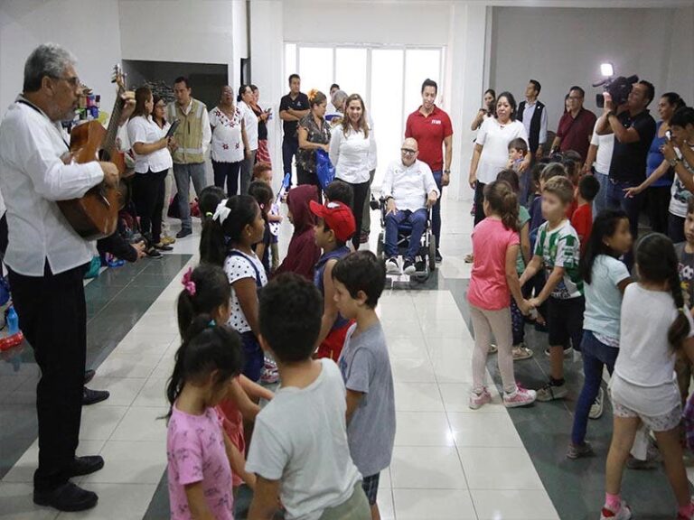 En primer lugar, la Primera Autoridad Municipal convivió con los niños del grupo de 5 a 8 años y les leyó el cuento “La rebelión de las gallinas”, de la escritora local Leticia Flores; posteriormente, saludó a los menores de entre 9 y 12 años de edad, quienes tomaban clases de folclore en otro de los salones del Centro Cultural de las Artes, ubicado en la Avenida Tulum.