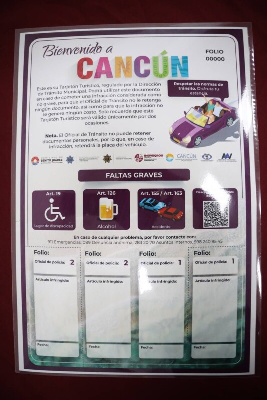 Con el fin de otorgar seguridad a los turistas nacionales y extranjeros que transitan en Cancún, la presidenta municipal, Ana Paty Peralta, presentó el tarjetón turístico que regresa a Benito Juárez después de nueve años de su primera emisión, para uso de viajeros que cometan infracciones de tránsito consideradas no graves.