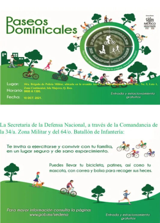 Luego de mas de año y medio de que quedaran suspendidos a causa de la pandemia de covid-19 en el estado, la Secretaría de la Defensa Nacional (Sedena), retoma la invitación a la población de Cancún en general, para que asistan a los «paseos dominicales» en Ciudad Militar a partir de este 10 de octubre.