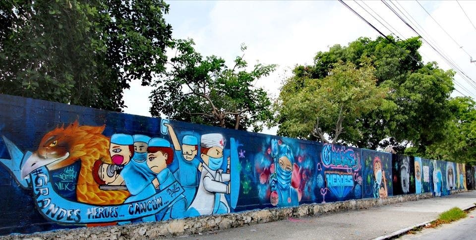 Rinden artistas grafiteros homenaje a héroes caídos por el Covid-19.- Un grupo de artistas jóvenes que integran el movimiento “X La Pinta», elaboró en la barda de la Escuela Primaria ‘Frida Kahlo’, ubicada en la región 228, el mural “Los guerreros caídos por y para el pueblo”, que busca rendir homenaje a los héroes caídos durante el combate al Covid-19 en Quintana Roo.