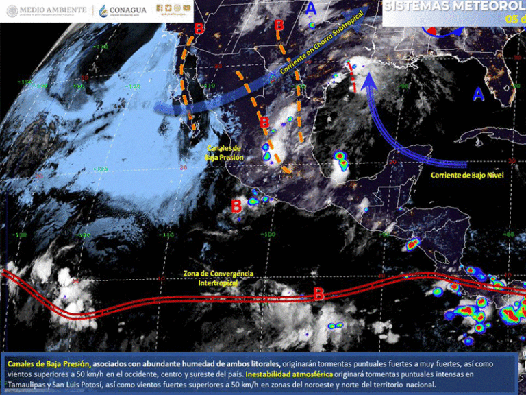 A su vez, un canal de baja presión atmosférica y el abundante ingreso de humedad proveniente de ambos océanos provocarán tormentas muy fuertes en regiones de Michoacán, Puebla, Veracruz, Guerrero, Oaxaca, Tabasco y Chiapas; fuertes en áreas de Guanajuato, Querétaro, Hidalgo, Tlaxcala, Estado de México, Ciudad de México y Morelos; chubascos en sitios de Aguascalientes y Jalisco, así como lluvias aisladas en Durango, Zacatecas, Nayarit, Colima, Campeche, Yucatán y Quintana Roo.