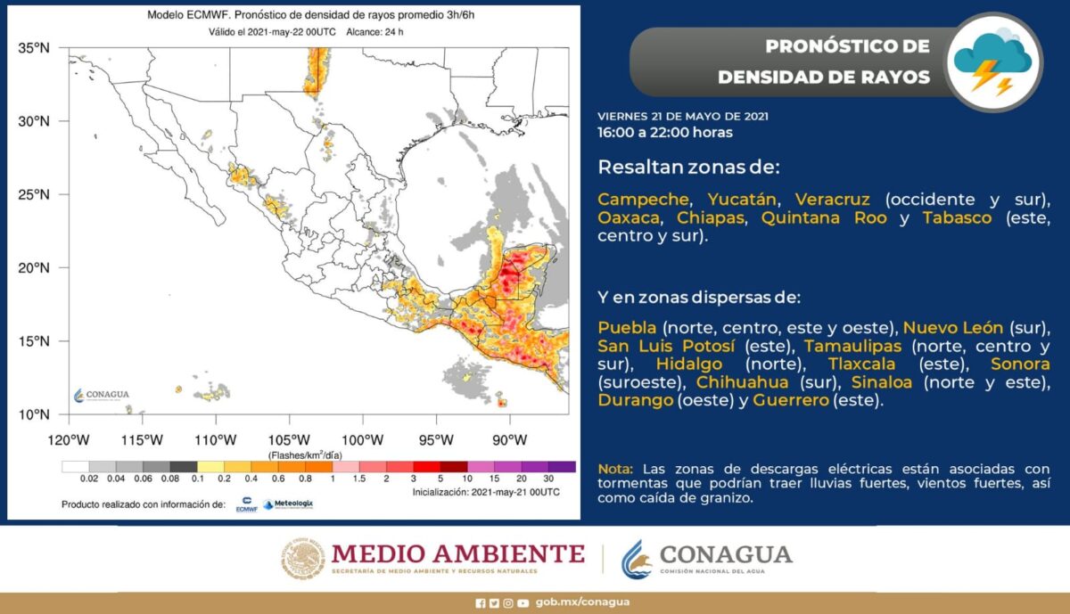 Esta tarde y noche se esperan descargas eléctricas en el sureste del país y la Península de Yucatán, por lo que se pide a la población tomar precauciones.