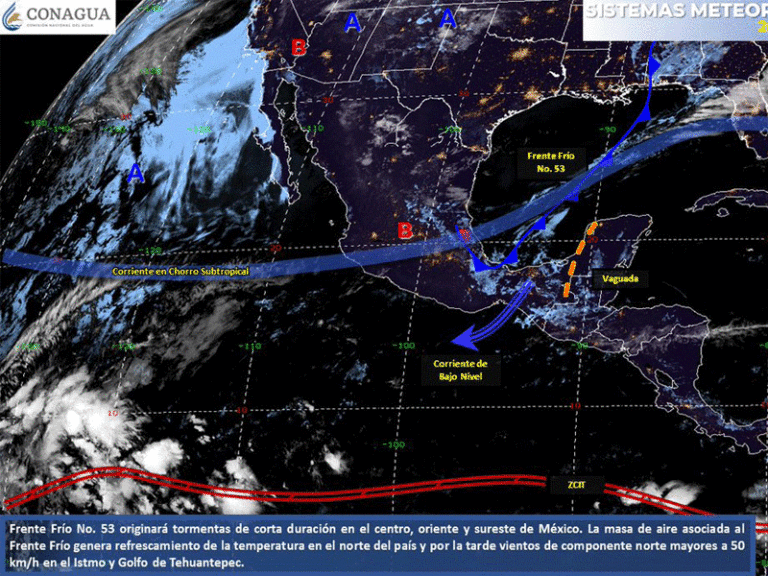Por su parte, el frente frío No. 53 y un canal de baja presión, localizados sobre el Golfo de México y Sonda de Campeche, respectivamente, se mueven lentamente al sur-sureste, están provocando temperaturas frescas, viento fresco y arrachado del norte e incremento de nubosidad y lluvias.