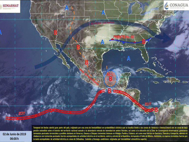 El temporal de lluvias cubrirá gran parte de la República Mexicana y será originado por una zona de inestabilidad con probabilidad ciclónica que se localiza frente a las costas de Veracruz, en interacción con un canal de baja presión extendido sobre el interior del territorio nacional, la abundante entrada de humedad de ambos litorales, la zona de convergencia Intertropical, y por inestabilidad atmosférica superior.