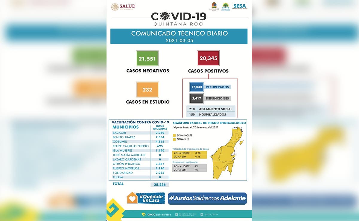 Los contagios por covid-19, en Quintana Roo, se han mantenido con una tendencia relativamente estable, de hecho, al corte de este viernes 05 de marzo, la entidad reporta 36 nuevos casos, así como seis defunciones más por esta enfermedad.
