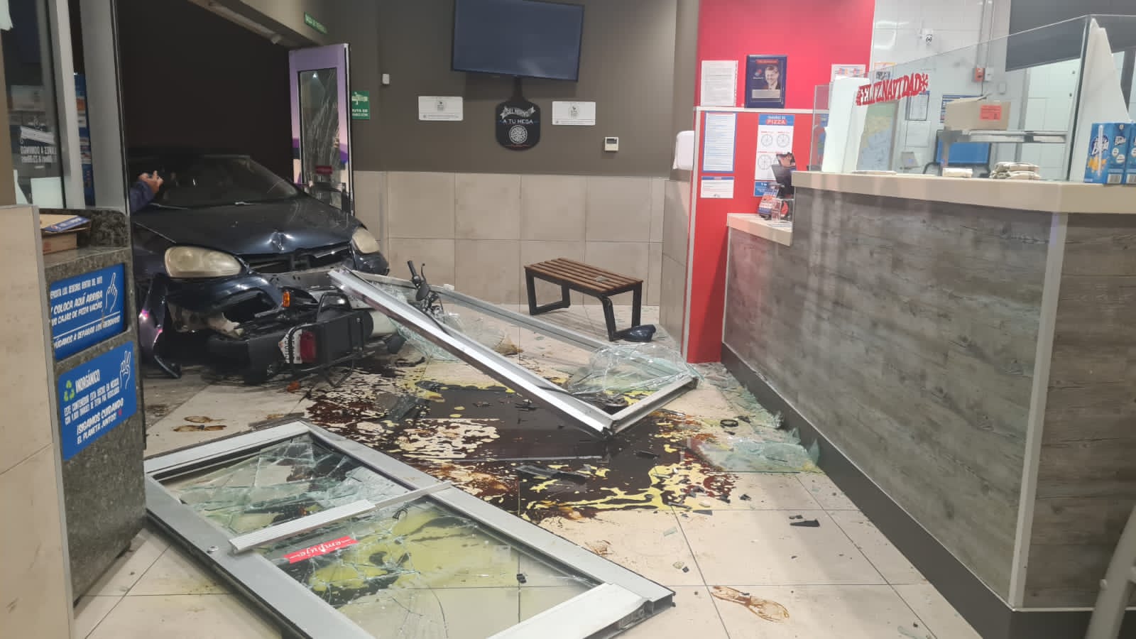 Asimismo, continúa su trayectoria, choca y derriba la puerta de cristal del local de Domino’s Pizza, además de ocasionar otros daños al interior.