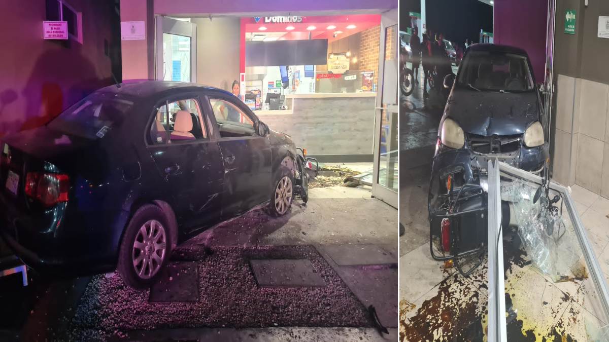 Asimismo, continúa su trayectoria, choca y derriba la puerta de cristal del local de Domino’s Pizza, además de ocasionar otros daños al interior.