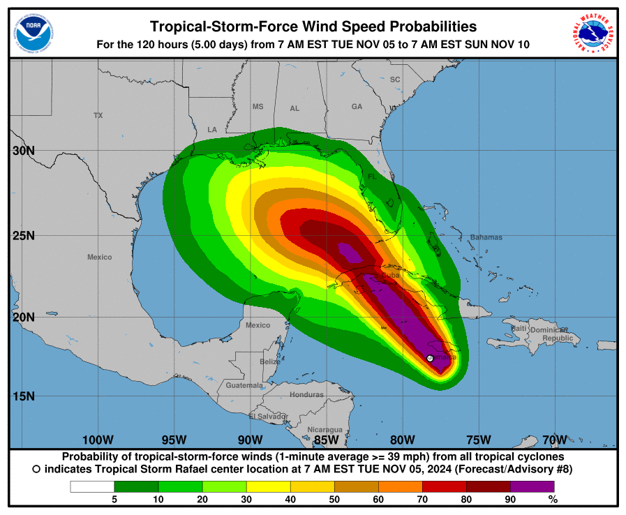 De acuerdo con el probable patrón de trayectoria, “Rafael” se moverá cerca de Jamaica esta mañana y de las Islas Caimán esta noche, para situarse cerca de Cuba el miércoles.