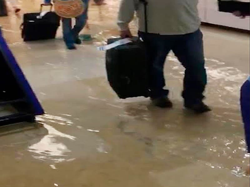 A través de la cuenta de Twitter @FAM_Draco, el usuario Jaime Hudson Treppiedi subió un video donde se observa a los turistas cargando maletas y caminando entre el agua, que alcanzó varios centímetros en el interior de la terminal aérea.