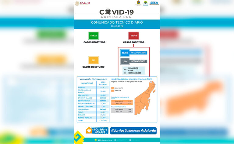 También se informa, dentro del mismo informe de la Sesa, que dentro de los esfuerzos de contención de la pandemia, se han aplicado hasta el momento en la campaña permanente de vacunación contra el virus, un total de un millón 425 mil 632 dosis de la vacuna contra el covid-19 en Quintana Roo.