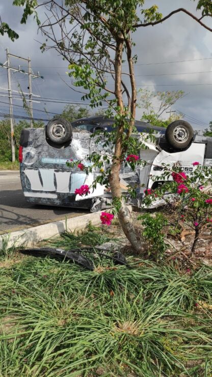 #Accidente | Fuerte percance en el bulevar Colosio de #Cancún, en donde una Urvan terminó volcada, tras chocar por el exceso de velocidad. Lesionado el chofer.