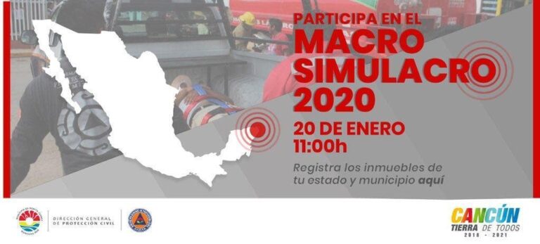 Con el propósito de fomentar la cultura de la protección civil en la población y contribuir con el fortalecimiento de las capacidades de reacción de las unidades internas y sus brigadas ante la eventualidad de una emergencia o desastre, la Dirección General de Protección Civil y el Centro Nacional de Prevención de Desastres convocaron a instituciones públicas y privadas a nivel nacional a participar en el Macrosimulacro que se llevará a cabo el próximo lunes 20 de enero y Cancún participará.