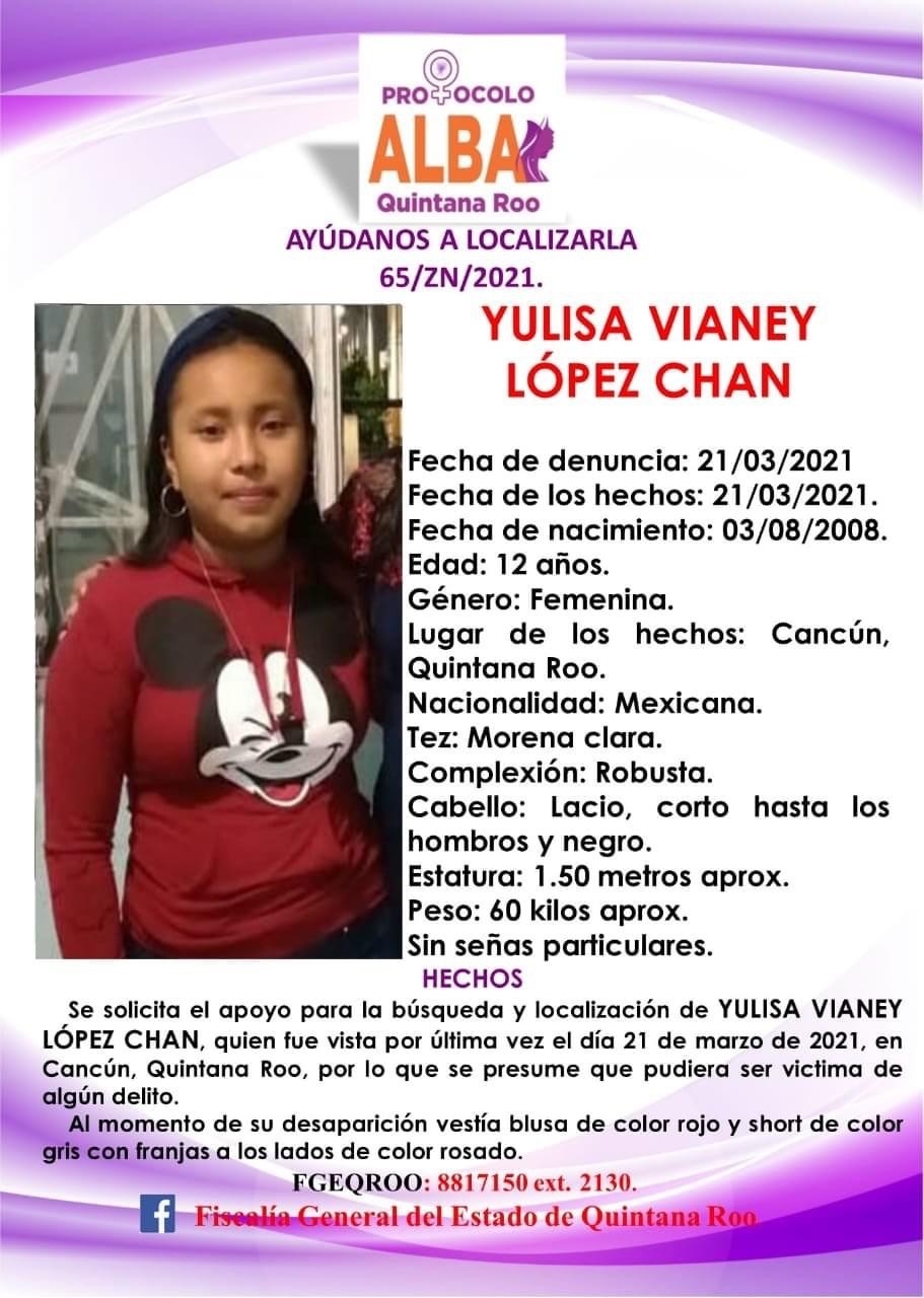 De nueva cuenta, la Fiscalía General del Estado (FGE) de Quintana Roo emitió otra ficha por la desaparición de una mujer más en la entidad; se trata de la pequeña Yulisa Vianey López Chan, de 12 años, y quien fue vista por última vez el pasado domingo 21 de marzo en Cancún.