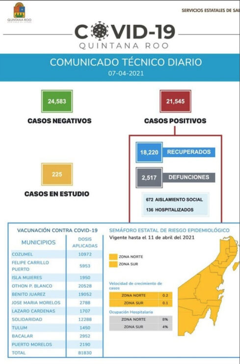 Sesa reporta 56 contagios nuevos por covid-19, este 7 de abril, la Secretaria de Salud de Quintana Roo reportó un total de 56 nuevos contagios del virus, así como 4 defunciones más por esta causa.
