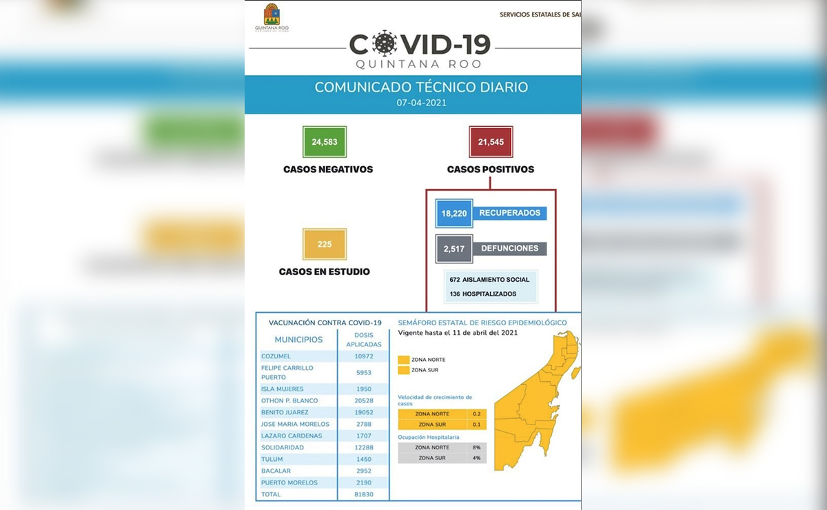 Sesa reporta 56 contagios nuevos por covid-19, este 7 de abril, la Secretaria de Salud de Quintana Roo reportó un total de 56 nuevos contagios del virus, así como 4 defunciones más por esta causa.