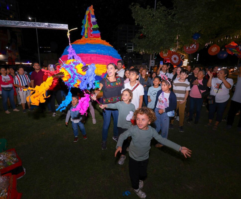 Acompañada de servidores públicos municipales, ciudadanos y sus dos hijos, además de Santa Claus y la Señora Claus, la alcaldesa se dirigió al primer punto ubicado entre la avenida Bonampak y avenida Sayil, frente a la plaza de toros, el cual fue adornado con tres piñatas grandes a ras de piso, esferas azules y un letrero de 2026.