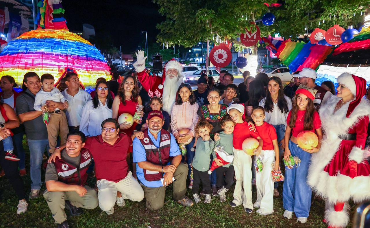 Acompañada de servidores públicos municipales, ciudadanos y sus dos hijos, además de Santa Claus y la Señora Claus, la alcaldesa se dirigió al primer punto ubicado entre la avenida Bonampak y avenida Sayil, frente a la plaza de toros, el cual fue adornado con tres piñatas grandes a ras de piso, esferas azules y un letrero de 2026.