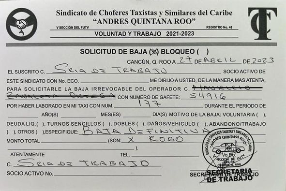 A través de las redes sociales, el Sindicato de Taxistas “Andrés Quintana Roo» de la ciudad de Cancún, dio a conocer que dio de baja a un taxista operador de este gremio, por una acusación de robo.