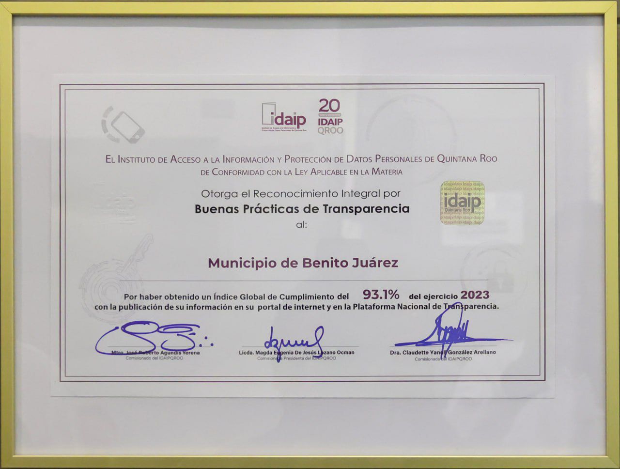 El municipio de Benito Juárez, recibió el Acuerdo de Mérito a las buenas prácticas de transparencia, como parte del evento “Resultados de la Verificación Virtual Oficiosa a las Obligaciones de Transparencia”, realizado en Chetumal el pasado 14 de agosto, con la asistencia de la gobernadora Mara Lezama, en compañía de la comisionada presidenta del Instituto de Acceso a la Información y Protección de Datos Personales de Quintana Roo (Idaipqroo), Magda Eugenia De Jesús Lozano Ocman.