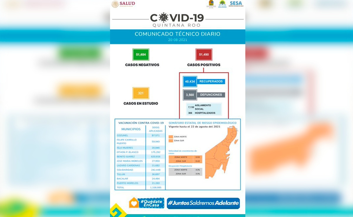 También se informa, dentro del mismo informe de la Sesa, referente a los esfuerzos de contención de la pandemia, que el numero de dosis inoculadas de la vacuna contra el covid-19 en Quintana Roo permanece en un millón 338 mil 995 , puesto que durante los últimos tres días no se ha realizado ninguna jornada de vacunación.