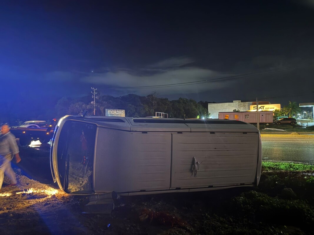 Sufre conductor aparatosa volcadura en el Bulevar Colosio de Cancún; pierde el control del volante al no tomar en cuenta el pavimento mojado.