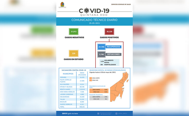 Paralelamente, dentro de los esfuerzos de contención de la pandemia, se han aplicado hasta el momento un total de 306 mil 101 dosis de la vacuna contra el covid-19 en el estado de Quintana Roo.