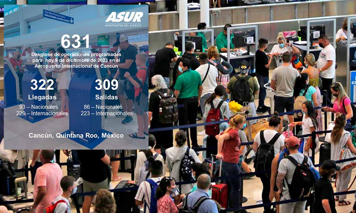 En plena temporada decembrina, el flujo de usuarios en el Aeropuerto Internacional de Cancún (AIC) se ha incrementado, y para esta jornada sabatina del 09 de diciembre, logró registrar un total de 631 vuelos.