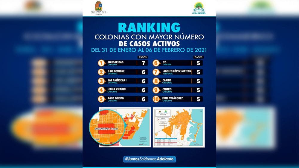 En la primera posición con 7 casos, está la colonia Solidaridad de la Capital del Estado, le siguen la 6 de octubre, las Américas 1, la colonia Leona Vicario, Payo Obispo, Adolfo López Mateos, Caribe, Centro y Fidel Velázquez, en Cancún la colonia con más casos fue la región 96.