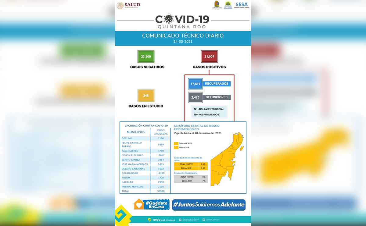 Quintana Roo superó los 21 mil casos positivos de covid-19, siendo 65 nuevos contagios y 4 defunciones, los que se registran al corte de este miércoles 24 de marzo