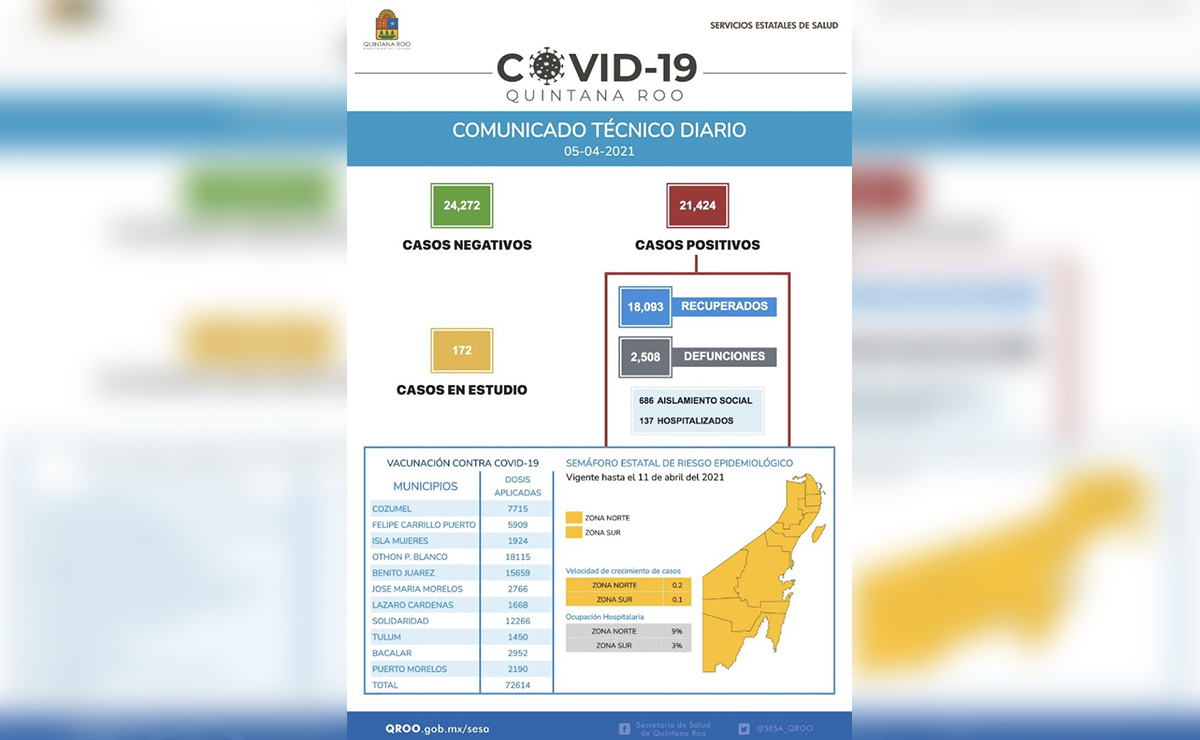 En cuanto a la aplicación de las vacunas para contener el virus, hasta el corte de hoy, han sido inoculadas 72 mil 614 vacunas contra el covid-19 en Quintana Roo.