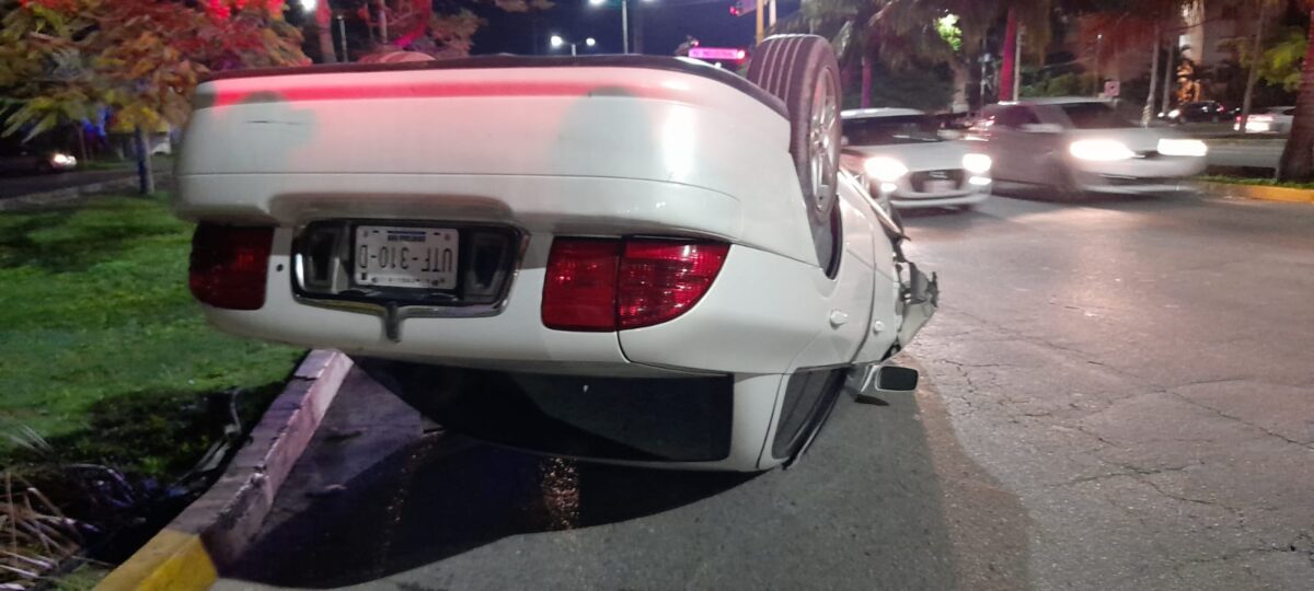 Termina volcado por ‘volar’ en la Andrés Quintana Roo; conductor pierde el control por rebasar el límite de velocidad y banquetear.