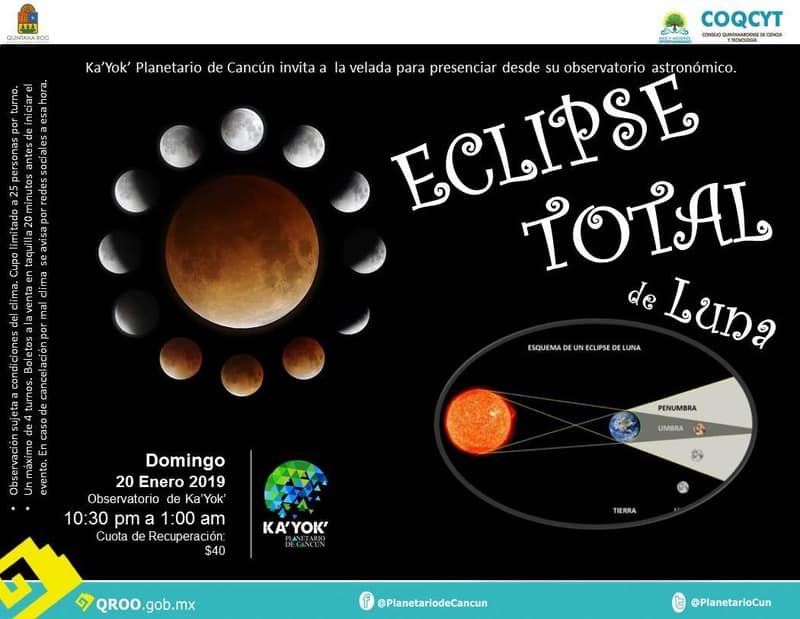 El planetario Ka’ Yok abre sus puertas este domingo a las 10:30 de la noche y hasta la 1 de la madrugada del lunes 21 de enero para poder apreciar uno de los fenómenos más esperados por los astrónomos: un eclipse total de Luna, de tales características que no se repetirá hasta mayo del 2021.