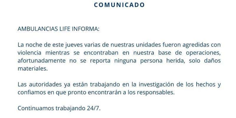 De igual manera, Ambulancias Life indicó que las autoridades ya están trabajando en la investigación de los hechos.