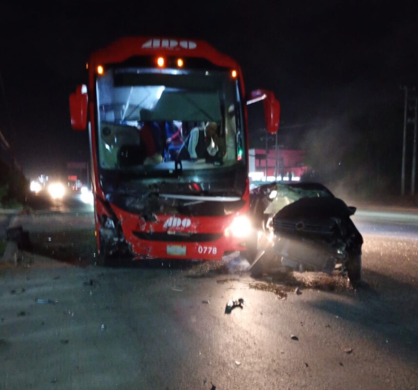 En sentido opuesto, es decir hacia el centro de Cancún, llegaba la unidad de pasaje Volvo, color rojo de la empresa ADO, con número económico 0778, matrículas 68HA2J del SPF, cuyo conductor Jaime G.M., de 57 años, no logró esquivar al vehículo impactándolo en el costado.