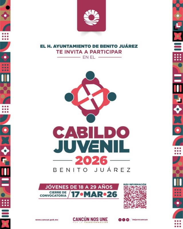 Cancún, Q. R., a 10 de marzo de 2026.- El Ayuntamiento de Benito Juárez, a través del Instituto Municipal de la Juventud (Imjuve) y en coordinación con la Comisión para el Desarrollo Juvenil, convoca a los cancunenses de 18 a 29 años a participar en el “Cabildo Juvenil 2026”, espacio de análisis y expresión para enriquecer el marco normativo municipal.